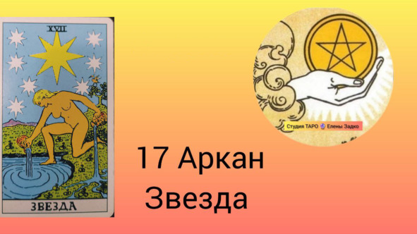 На голубом фоне золотоволосая обнаженная девушка, ее правая стопа осторожно погружается в воду, левой ногой она опирается на озелененный берег, в ее руках два сосуда, из которых льется вода, на заднем плане цветущее дерево на котором сидит птичка, в центре на небе золотая восьмиконечная звезда, и семь серебряных звезд.