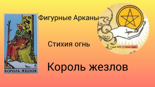 На золотом троне видны символы львов и саламандр, такие же символы изображены на золотом плаще, король жезлов сидит в активной позе, словно он готов в любой момент к активным действиям, его одежда ярко красная, золотая корона, обувь и накидка зеленого цвета, на груди украшение, в правой руке символ его власти жезл, под ногами серая основа и саламандра.