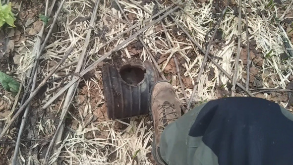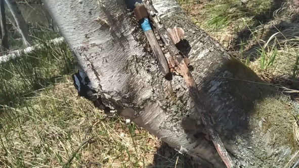 Попался топор. Он торчал в расчалках березы отсвечивая синей советской изолентой. С первого взгляд было ясно понятно для чего он там дежурил. На этой же березе торчала большая шляпа чаги и проходящий путник легко мог присвоить ее себе используя заботливо оставленный топор.