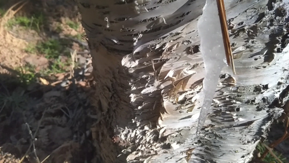 Сегодня требовалось решить проблему сыроватой зыбкости ощущений во сне. В наличии имелась японская двухлитровая бутылка, что уже облегчало задачу. Японские бутылки более устойчивы к кипятку в отличии от наших. И при отходе ко сну в нее была запихана пыхчащая паром вода. Бутылка быстро потеряла свою оквадратуренную форму и вознамерилась стать овальной, зато во всем остальном была на должном уроне – главное что крышка уверенно держала жидкость и до и после всех испытаний. Как водится была совершена первая ошибка. Бутылка в обнаженном виде полетела в ножной отдел спальника. Чуть позже до мозга экспериментатора дошло, что оголенное тело бутылки нанесет термотравму спальнику – это раз, очень быстро отдаст тепло – это уже два. Требовалось избежать всех вышеперечисленных огрехов, хотя бы на последующих ночевках. Вот здесь и послужили свою службу зимние сапожные вкладыши. В один из них вставлялась бутылка, вторым была попытка заделать дыру сверху, но сие не прошло жизненных испытаний. В качестве затычки послужат перчатки. Качество такой грелки мгновенно повысилось значительно. Тепло стало выделяться значительно спокойней, а значит дольше. Оно уже не обжигало, а по домашнему грело, и даже по прошествии 6 часов я нащупывал существенно теплую бутылку внутри вкладыша. И пусть последние часы сна спальник больше выпускал тепла, чем поступало, инерции грелки хватало, чтобы очень комфортно дрыхнуть до утра. А требовалось сказать, что ночи, на редкость были крайне злыми на температуры. Рано утром, но уже при свете, оказавшись на свободе и поразившись контрасту воздушной температуры снаружи и в спальнике, его взгляд кинулся на котелок с бывшим березовым соком. С травинки, что была проводником влаги от дерева в котелок, свисала огромная ледяная сосулька, а в самом сосуде торчала ледяная глыба промороженная до самого дна, хоть котят на коньках запускай.