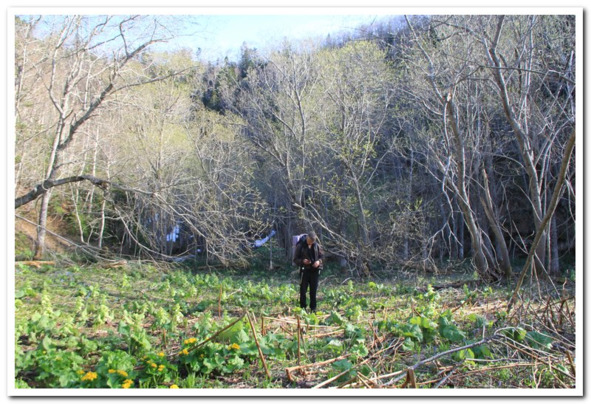 Сразу за этим благообразием начались первые трудности, которые всегда закаляют так же, как и раздражают. Река прыгала через большой порог вжимаясь в скалу. Используя растяжку и просто удачу, мы прошли по краю и выбрались на медвежью тропу. Она делала красивый пируэт перебрасывая нас через мысок. Долина тем временем разошлась и открыла красивые поляны с застывшей к броску в жизнь травой. Калужница дарила незабываемый желтый цвет, а река холодные зрачки воды, которые смотрели тебе в ноги так и норовя вцепиться в них холодом. Но каждый раз, когда это казалось неизбежным, какое-нибудь дерево резво падало поперек реки, чем мы и пользовались.