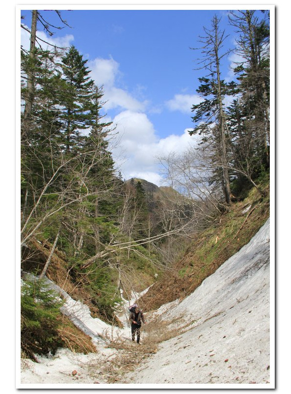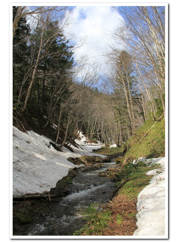 Пошли в первый ручей, а он нам был не рад, даже не улыбнулся. Грязновато чистый снег неудобно застрял в русле. Часто он был провальный, и я почувствовал себя раза два в провалившемся лифте. Шел то я первый, а Ксения пожинала плоды и немного смеялась.