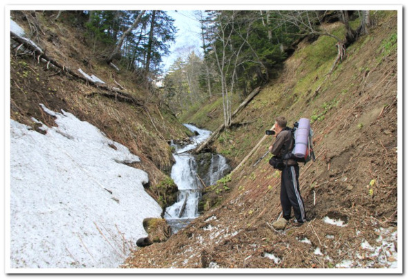 Водопад был немного другим, чем его собрат чуть северней на р. Вахрушевка, но он более обзорный, перед ним широко открывается местность, чтобы сразу запахнуться в узкую щель природного камня, через который и рвалась неуемная вода. Все это обрамлялось соответствующими видами и подсвечивалось весенним снегом под ним. Мы сделали пару рисунков его и стали рисковать жизнью. Полезли по склону в обход. Склон оказался не обходительным, крутым в своем решении не участвовать в нашем прорыве наверх, поэтому мы безбожно скользили хаотично цепляясь за травинки, чтобы немного приблизиться к выходу. Это спортивное мероприятие съело немало лишних калорий и нервов. Но в этот раз все справились с заданием. Сразу за водопадом отряхнулись от налипшей на верхнюю одежду лесной и травяной биомассы, и с неуемной силой рванули в голубеющую даль. День был солнечно неправдоподобен. К тому же воняло тухлым яйцами. Белесый ручей выполз как змея из боковины склона и внедрялся в чистый, ничего не подозревающий ручей. На участке в метров сто их было три штуки, но самый мощный был ближайший к водопаду.
