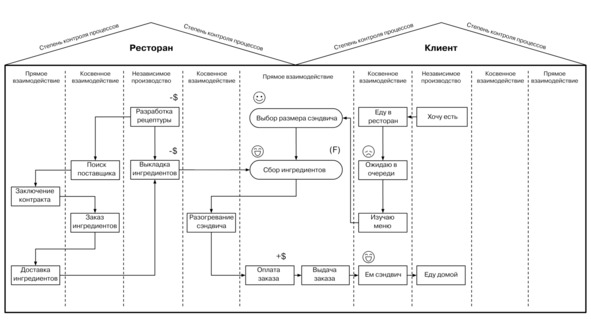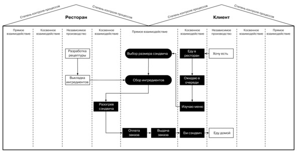 Например, при заказе сэндвича с доставкой мы можем описать процедуру получения и приготовления заказа. Но если сотрудничаем со службой доставки, то анализ сервисных процессов на их стороне сильно затруднен. Курьер может заблудиться, нагрубить клиенту, но мы не узнаем причину такого поведения.