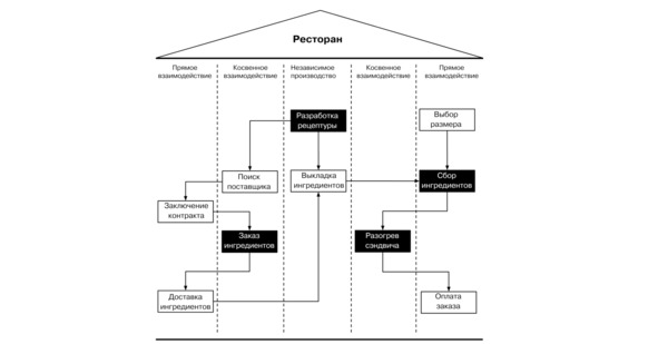 Ответим на вопрос: «Откуда мы получаем сэндвич?» Вероятно, со сборочной линии. А как он попадает на нее? Скорее всего, после того как клиент выразил желание сделать заказ, а сотрудник начал сборку ингредиентов. Как клиент решает, что ему заказать? Сэндвичная разрабатывает меню и собирает рецептуру, по которой работники будут изготавливать его на кухне. Чтобы разработать рецептуру, ресторану надо понимать, какие ингредиенты есть на рынке и у поставщика. Заказать их у поставщика, доставить и складировать. Чтобы их заказать, нужно заключить договор на поставку и потом взаимодействовать с поставщиком для формирования заказа.