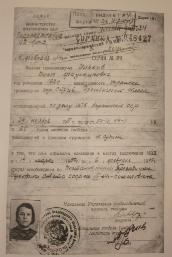 Моя тетрадка с записями сохранилась потому, что был в тюрьме такой Шупляк, который меня не шмонал при обыске. А другой говорил: «У меня громкая украинская фамилия Шевченко, но я уже русский». А я думаю: «Вот ты это сказал, как будто бы я порадоваться за тебя могу, что ты уже русский». А он говорит: «У Вас детки, покайтесь». В конце концов, я решила: «Спрошу Зарицкую». Зарицкая говорит: «Оля, Вы не смотрите на меня. У моих детей есть „мама“ — весь Львов знает, что это дети националистов. А ваши дети погибнут. Но чтобы Вы были уверены в правильности своего решения, то давайте будем молиться святому Николаю». Я помолилась и после этого думаю: «А почему бы не написать раскаяние?» Ну и, одним словом, я покаялась и ради детей вышла из тюрьмы раньше, в 1964 году. Когда писала раскаяние, то начала так: «Я родилась на том куске земли, который горел. И я горела вместе с ним». Галя Дидык увидела и говорит: «Оля, это что, Вы пишете диссертацию о националистах?» А я ей: «Галя, я по-другому не могу».