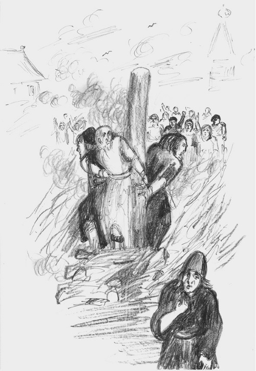 Какой-то мужик в длинном армяке поднёс к брёвнам пылающий факел. За ним ещё двое или трое с разных сторон бросились поджигать костёр. Сухое дерево занималось быстро, и через несколько мгновений ветер вздул яростное пламя выше макушки столба.