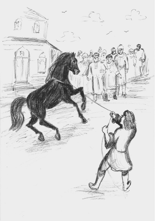 Необычайно крупный вороной жеребец бешено вскинулся на дыбы, стал бить в воздухе копытами. Аркан всё теснее схватывал его мощную шею, но от этого он лишь сильнее свирепел. Князь Александр изо всех сил обеими руками натягивал верёвку. За несколько секунд его лицо густо покрыл пот. Конь дёргал аркан, гулко, неистово ржал. В какой-то момент мальчик, не выдержав, упал на одно колено. Казалось, вот-вот он не удержится и скакун поволочёт его за собой по земле.