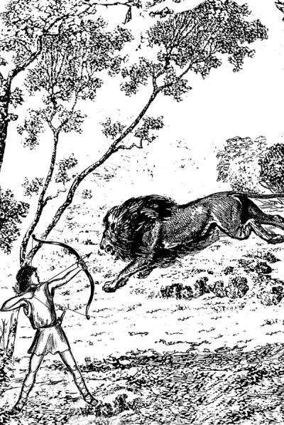 Между тем, Ахилл наложил стрелу на тетиву и спокойно ждал. Он уже отчетливо видел просвечивающую сквозь ветви кустов желтую шкуру зверя, своим необычайно острым слухом различал его дыхание. И по тому, как лев внезапно замер, понял, что хищник сейчас прыгнет на них.