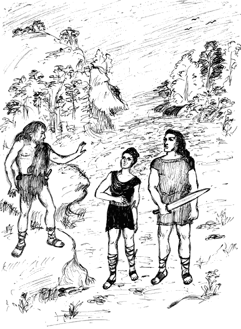 То был мужчина лет сорока, высокий и поджарый – его природная гибкость стала еще виднее благодаря сильной худобе и густому загару, покрывавшему тело сплошь, потому что он был почти нагим. Единственной его одеждой было подобие плаща, сделанного из двух козьих шкур и в жаркие дни спасавшего спину от ожогов. Сейчас этот плащ, превратившийся за пару лет в клочковатые лохмотья, висел на левом плече, подхваченный в талии сыромятным ремнем. При таком наряде довольно странно выглядели самые настоящие, когда-то прочные и даже красивые сандалии, от которых теперь оставались только сильно разбитые подошвы да остатки прежде высокой шнуровки – каждый ремешок был связан из обрывков и кусочков. На сыромятном поясе висели нож в самодельных ножнах и мешочек, в котором, судя по небольшим размерам, могло быть огниво.