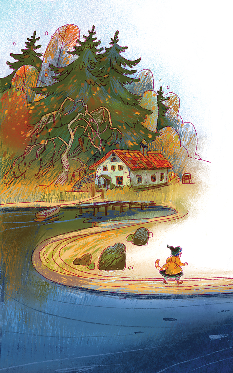 Госпожа Тасси ёжилась под октябрьским ветром и вдруг заметила над деревьями печной дымок. Запах горящих поленьев наполнил болотце, и госпожа Тасси на мгновение зажмурилась от удовольствия. Потом зажмурилась ещё раз и ещё. А затем стала продираться сквозь багульник туда, где за деревьями, прямо у воды, виднелось что-то красноватое. Когда она подошла поближе, разглядела выкрашенный красным опрятный домик – такой крохотный, что в нём наверняка была лишь одна комната. А на веранде в кресле-качалке сидел их новый сосед, до самого носа укутанный пледом.