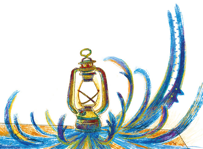 Учитель Трелла направился к сундуку. Порывшись в нём, он достал старую керосиновую лампу и с гордостью водрузил её на середину стола. Правда, керосина у него не было, но гостям показалось, что от самого вида лампы в комнате стало чуточку светлее.