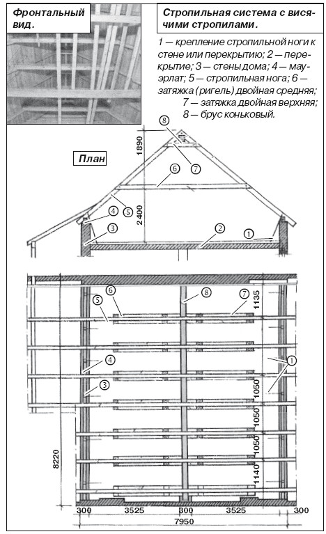 Простейшая несущая конструкция для двухскатной крыши состоит из стропильных ног, двойных затяжек, конькового бруса. Стены первого этажа здесь подняты над уровнем перекрытия, что позволяет существенно расширить площадь мансарды; стропильные ноги опираются на деревянные мауэрлаты, закрепленные анкерными болтами к несущей стене. Поверхность мауэрлата отделена от стены сплошной гидроизоляцией (рубероид на битумной мастике). Средние затяжки придают конструкции необходимую жесткость и одновременно могут являться несущими элементами для чердачного перекрытия. Такие стропила называются висячими. Благодаря многим преимуществам эта конструкция широко применяется при строительстве индивидуальных домов.