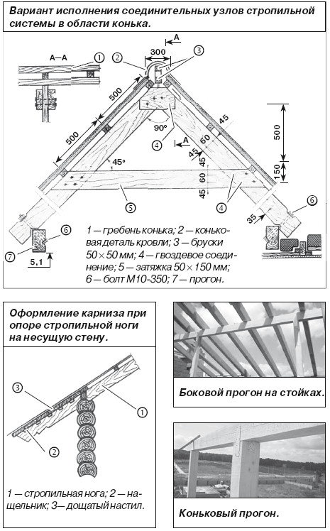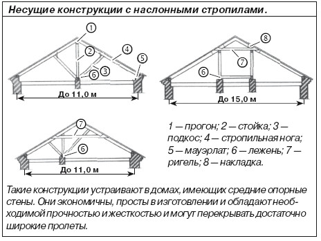 Наслонные стропила устанавливают в домах со средней несущей стеной. Они состоят из двух наклонных стропильных ног, нижними концами опирающихся на продольные брусья – мауэрлаты, верхними – на коньковый прогон, поддерживаемый стойками, устанавливаемыми на лежень на внутренней несущей стене. Лежень и мауэрлат распределяют нагрузки на стены. Если нет внутренних продольных стен, стропила опирают на внутренние поперечные стены или столбы. Расстояние между опорами не должно превышать 6,5 м. Дополнительная опора позволяет увеличивать ширину перекрываемого помещения до 12 м, а две дополнительные опоры – до 15–16 м. С увеличением пролета конструкция усложняется за счет введения дополнительных элементов – стоек, подкосов, увеличивающих поперечную жесткость и устойчивость стропильной системы в целом и превращающих стропильную конструкцию в ферму.