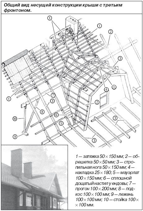 При четырехскатных или более сложных формах крыш стропильные конструкции усложняются. В местах пересечения скатов ставят диагональные стропильные ноги. На них опирают короткие стропильные ноги торцевых скатов. Верхними концами диагональные ноги опираются на консоль конькового бруса или коротыш в месте стыка стропильных ног у конька; нижними – на мауэрлаты в месте их стыкования в углу. Диагональные ноги имеют большую длину и несут значительную нагрузку, поэтому их поддерживают промежуточной опорой. На мансардных крышах применяют фермы особых конструкций с межэтажным перекрытием вместо затяжки.