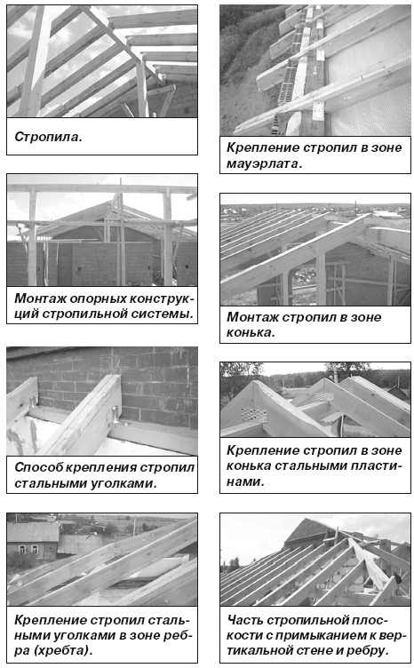 В деревянных и брусовых домах стропильные ноги опираются на верхние венцы, составляющие горизонтальный ряд сруба, в каркасных – на верхнюю обвязку. В каменных (кирпичных, легкобетонных) домах для опирания стропильных ног используют мауэрлаты (подстропильные брусья), служащие для закрепления концов ног и распределения давления от крыши на большую площадь каменной кладки. Если стропильные ноги ставят редко, мауэрлаты представляют собой короткие брусья (коротыши) длиной 500–700 мм; при частом расположении стропильных ног мауэрлат укладывают по всей длине стены. Все деревянные элементы стропил изолируют от каменной кладки слоем гидроизоляционного материала.