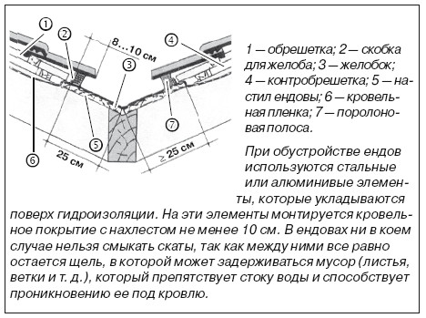 При этом расстояние между брусками принимают в соответствии с размерами и прочностью кровельных плит и листов. Для черепичных покрытий оно зависит от длины черепицы и уклона крыши, для металлочерепицы – от длины волны и т. д. Толщину настила и сечение брусков обрешетки определяют уклон ската, вид кровельного материала и шаг стропил. Стыки брусков или досок должны располагаться на опорах, а длина их – быть не меньше двух пролетов между опорами. Вокруг дымоходов и других выступающих элементов, в ендовах, на карнизах обрешеткой служит настил из обрезной доски сечением 25 × (100–150) мм. Элементы обрешетки (доски, бруски) прибивают к стропильным ногам оцинкованными гвоздями.