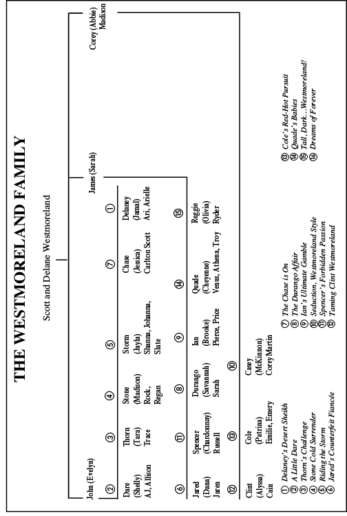 Little did I know that when I first introduced the Westmoreland family, they would become hugely popular amongst readers. Originally the Westmoreland family series was intended to be just six books, Delaney and her five brothers—Dare, Thorn, Stone, Storm and Chase. Later I wanted my readers to meet their cousins—Jared, Spencer, Durango, Ian, Quade and Reggie. Finally, there were Uncle Corey’s triplets—Clint, Cole and Casey.