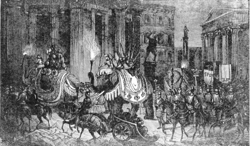 Then came his triumphs. Triumphs were great celebrations, by which military heroes in the days of the Roman commonwealth signalized their victories on their return to the city Caesar's triumphs were four, one for each of his four great successful campaigns, viz., in Egypt, in Asia Minor, in Africa, and in Spain. Each was celebrated on a separate day, and there was an interval of several days between them, to magnify their importance, and swell the general interest which they excited among the vast population of the city. On one of these days, the triumphal car in which Caesar rode, which was most magnificently adorned, broke down on the way, and Caesar was nearly thrown out of it by the shock. The immense train of cars, horses, elephants, flags, banners, captives, and trophies which formed the splendid procession was all stopped by the accident, and a considerable delay ensued. Night came on, in fact before the column could again be put in motion to enter the city, and then Caesar, whose genius was never more strikingly shown than when he had opportunity to turn a calamity to advantage, conceived the idea of employing the forty elephants of the train as torch-bearers; the long procession accordingly advanced through the streets and ascended to the Capitol, lighted by the great blazing flambeaus which the sagacious and docile beasts were easily taught to bear, each elephant holding one in his proboscis, and waving it above the crowd around him.