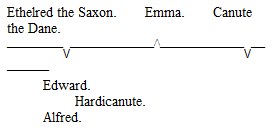 Still, her mind was ill at ease. Harold, though the son of her husband, was not her own son, and the ambitious spirit which led her to marry for her second husband her first husband's rival and enemy, that she might be a second time a queen, naturally made her desire that one of her own offspring, either on the Danish or the Saxon side, should inherit the kingdom; for the reader must not forget that Emma, besides being the mother of Hardicanute by her second husband Canute, the Danish sovereign, was also the mother of Edward and Alfred by her first husband Ethelred, of the Anglo-Saxon line, and that these two sons were in Normandy now. The family connection will be more apparent to the eye by the following scheme: