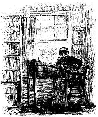 While he was speaking, the door opened, and James, the young man who lived at Forester's father's came in, bringing a desk. It was painted blue, and had four legs. These legs were of such a length as to make the desk just high enough for Marco. James put it down, at Forester's direction, near the window. It was placed with the left side toward the window, so that the light from the window would strike across the desk from left to right. This is the most convenient direction for receiving light when one is writing. Forester then placed a chair before the desk, and Marco went into the house and brought out all the books and papers which he had, and arranged them neatly in his desk. While he was gone, Forester took an inkstand and a sand-box out of a closet by the side of the fire, and filled them both, and put them on the desk. He also placed in the desk a supply of paper, in quarter sheets. After Marco had come back, and had put in his books and papers, Forester gave him a ruler and a lead pencil; also a slate and half a dozen slate pencils; also a piece of sponge and a piece of India-rubber. He gave him besides a little square phial, and sent him to fill it with water, so that he might have water always at hand to wet his sponge with.