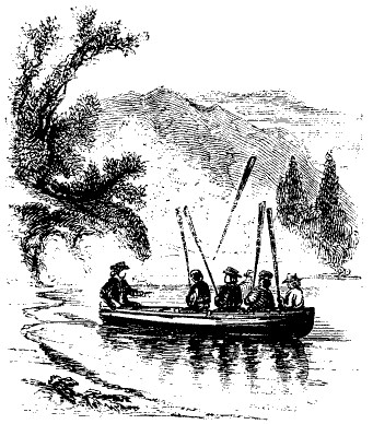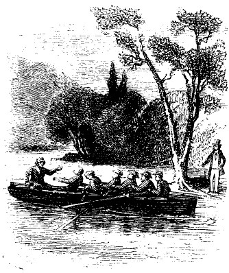 Forester steered in such a manner as to put the head of the boat toward a bank at some distance from where they started, on which there was a thick forest of firs and other evergreens, growing near the water. When they got pretty near the land, he gave the order for attention, that they might observe silence in going through whatever manoeuvers were required here. The next order was, Oars. At this the oarsmen stopped rowing, and held their oars horizontally over the water. The boat in the mean time was gliding on toward the shore.