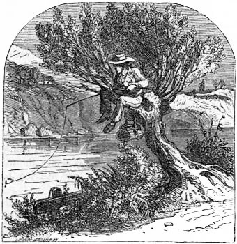 Rollo soon had occasion to be glad that he had acceded so readily to his father's wishes to continue in the path; for he soon came to something that amused him very much. It was a man sitting in the top of one of the willow trees that overhung the path, fishing. The willow leaned very much, and this made it easy to climb the stem of it. It had been headed down, too, so that there was a pretty good place to sit on the top of it. It was on the very brink of the stream, and indeed the leaning of the stem carried the top of the willow somewhat over the water, and thus it made quite a good place to sit and fish.