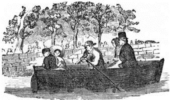 As the boat glided by this place, Rollo and Lucia saw some ladies and gentlemen sitting in the summer house. The gentlemen took off their hats and bowed to Mr. and Mrs. Holiday as they passed by.