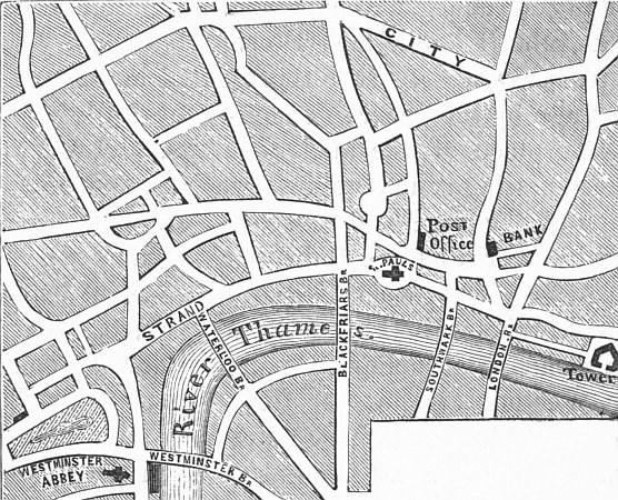 The city was the original London. The West End was at first called Westminster. The relative position of these two centres may be seen by the following map:—