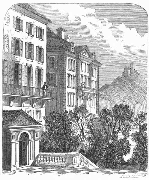 In the front part of the garden, towards the river, were several tables under the trees, where people might take coffee or ices, or they might take their dinner there if they chose. In the front of the garden too, at the corners, were two summer houses, with tables and chairs in them. The sides of these houses that were turned towards the river, and also those that were towards the gardens, were open. The other two sides of each summer house had walls, on which were painted views of castles and other scenery of the Rhine. Over one of the summer houses was a little room for a lookout, where there was a very fine prospect up and down the river.
