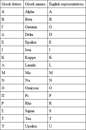 The letters which Cadmus brought were in number sixteen. The following table presents a view of his alphabet, presenting in the several columns, the letters themselves as subsequently written in Greece, the Greek names given to them, and their power as represented by the letters now in use. The forms, it will be seen, have been but little changed.