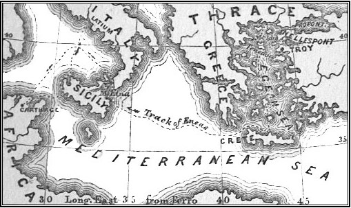After this, the party of Æneas spent many months in weary voyages from island to island, and from shore to shore, along the Mediterranean sea, encountering every imaginable difficulty and danger, and meeting continually with the strangest and most romantic adventures. At one time they were misled by a mistaken interpretation of prophecy to attempt a settlement in Crete – a green and beautiful island lying south of the Egean sea. They had applied to a sacred oracle, which had its seat at a certain consecrated spot which they visited in the course of their progress southward through the Egean sea, asking the oracle to direct them where to go in order to find a settled home. The oracle, in answer to their request, informed them that they were to go to the land that their ancestors had originally come from, before their settlement in Troy. Æneas applied to Anchises to inform them what land this was. Anchises replied, that he thought it was Crete. There was an ancient tradition, he said, that some distinguished men among the ancestors of the Trojans had originated in Crete; and he presumed accordingly that that was the land to which the oracle referred.