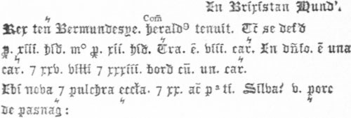 In Brixistan Hundredo.Rex tenet Bermundesye. Heraldus comes tenuit. Tunc se defendebat pro xiii. hidis, modo pro xii. hidis. Terra est viii. carrucatarum. In dominio est una carrucata et xxv. villani et xxxiii. bordarii cum una carrucata. Ibi nova et pulchra ecclesia, et xx. acræ prati. Silva v. porcis de pasnagio.
