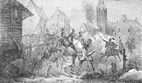 In the execution of his threat to make Philip's dominions too hot to hold him, William, as soon as he was able to mount his horse, headed an expedition, and crossed the frontiers of Normandy, and moved forward into the heart of France, laying waste the country, as he advanced, with fire and sword. He came soon to the town of Mantes, a town upon the Seine, directly on the road to Paris. William's soldiers attacked the town with furious impetuosity, carried it by assault, and set it on fire. William followed them in, through the gates, glorying in the fulfillment of his threats of vengeance. Some timbers from a burning house had fallen into the street, and, burning there, had left a smoldering bed of embers, in which the fire was still remaining. William, excited with the feeling of exultation and victory, was riding unguardedly on through the scene of ruin he had made, issuing orders, and shouting in a frantic manner as he went, when he was suddenly stopped by a violent recoil of his horse from the burning embers, on which he had stepped, and which had been concealed from view by the ashes which covered them. William, unwieldy and comparatively helpless as he was, was thrown with great force upon the pommel of the saddle. He saved himself from falling from the horse, but he immediately found that he had sustained some serious internal injury. He was obliged to dismount, and to be conveyed away, by a very sudden transition, from the dreadful scene of conflagration and vengeance which he had been enacting, to the solemn chamber of death. They made a litter for him, and a corps of strong men was designated to bear the heavy and now helpless burden back to Normandy.