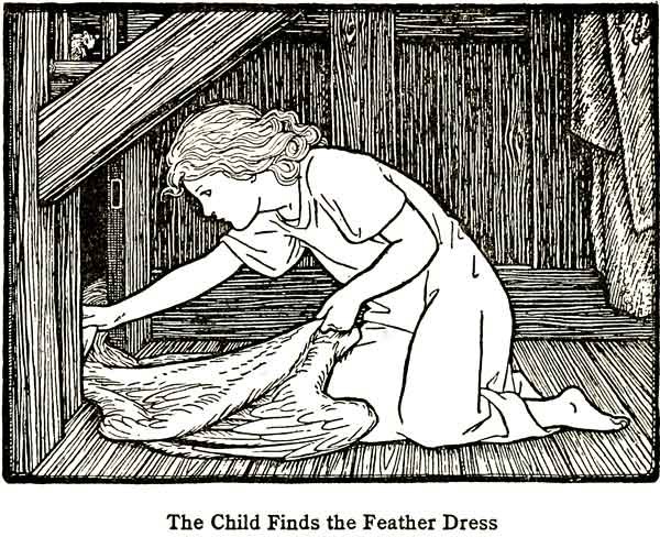 One day her little daughter was playing at hide-and-seek with her brother, and she went behind the wainscoting to hide herself, and found there a robe all made of feathers, and took it to her mother. As soon as she saw it she put it on and said to her daughter: