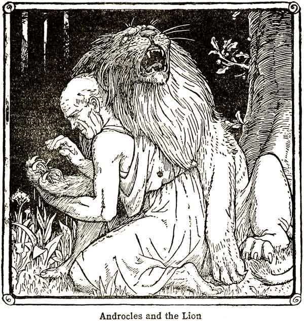 It happened in the old days at Rome that a slave named Androcles escaped from his master and fled into the forest, and he wandered there for a long time till he was weary and well nigh spent with hunger and despair. Just then he heard a lion near him moaning and groaning and at times roaring terribly. Tired as he was Androcles rose up and rushed away, as he thought, from the lion; but as he made his way through the bushes he stumbled over the root of a tree and fell down lamed, and when he tried to get up there he saw the lion coming towards him, limping on three feet and holding his fore-paw in front of him. Poor Androcles was in despair; he had not strength to rise and run away, and there was the lion coming upon him. But when the great beast came up to him instead of attacking him it kept on moaning and groaning and looking at Androcles, who saw that the lion was holding out his right paw, which was covered with blood and much swollen. Looking more closely at it Androcles saw a great big thorn pressed into the paw, which was the cause of all the lion's trouble. Plucking up courage he seized hold of the thorn and drew it out of the lion's paw, who roared with pain when the thorn came out, but soon after found such relief from it that he fawned upon Androcles and showed, in every way that he knew, to whom he owed the relief. Instead of eating him up he brought him a young deer that he had slain, and Androcles managed to make a meal from it. For some time the lion continued to bring the game he had killed to Androcles, who became quite fond of the huge beast.