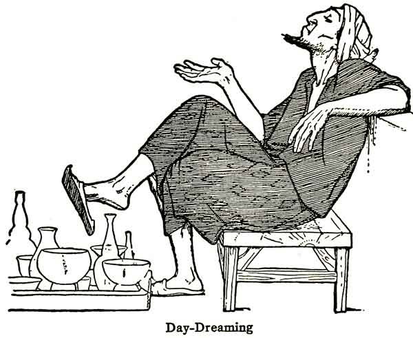 Now there was once a man at Bagdad who had seven sons, and when he died he left to each of them one hundred dirhems; and his fifth son, called Alnaschar the Babbler, invested all this money in some glassware, and, putting it in a big tray, from which to show and sell it, he sat down on a raised bench, at the foot of a wall, against which he leant back, placing the tray on the ground in front of him. As he sat he began day-dreaming and said to himself: "I have laid out a hundred dirhems on this glass. Now I will surely sell it for two hundred, and with it I will buy more glass and sell that for four hundred; nor will I cease to buy and sell till I become master of much wealth. With this I will buy all kinds of merchandise and jewels and perfumes and gain great profit on them till, God willing, I will make my capital a hundred thousand dinars or two million dirhems. Then I will buy a handsome house, together with slaves and horses and trappings of gold, and eat and drink, nor will there be a singing girl in the city but I will have her to sing to me." This he said looking at the tray before him with glassware worth a hundred dirhems. Then he continued: "When I have amassed a hundred thousand dinars I will send out marriage-brokers to demand for me in marriage the hand of the Vizier's daughter, for I hear that she is perfect in beauty and of surpassing grace. I will give her a dowry of a thousand dinars, and if her father consent, 'tis well; if not, I will take her by force, in spite of him. When I return home, I will buy ten little slaves and clothes for myself such as are worn by kings and sultans and get a saddle of gold, set thick with precious jewels. Then I will mount and parade the city, with slaves before and behind me, while the people will salute me and call down blessings upon me: after which I will go to the Vizier, the girl's father, with slaves behind and before me, as well as on either hand. When the Vizier sees me, he will rise and seating me in his own place, sit down below me, because I am his son-in-law. Now I will have with me two slaves with purses, in each a thousand dinars, and I will give him the thousand dinars of the dowry and make him a present of another thousand dinars so that he may recognize my nobility and generosity and greatness of mind and the littleness of the world in my eyes; and for every ten words he will say to me, I will answer him only two. Then I will return to my house, and if any one come to me on the bride's part, I will make him a present of money and clothe him in a robe of honour; but if he bring me a present I will return it to him and will not accept it so that they may know how great of soul I am." After a while Alnaschar continued: "Then I will command them to bring the Vizier's daughter to me in state and will get ready my house in fine condition to receive her. When the time of the unveiling of the bride is come, I will put on my richest clothes and sit down on a couch of brocaded silk, leaning on a cushion and turning my eyes neither to the right nor to the left, to show the haughtiness of my mind and the seriousness of my character. My bride shall stand before me like the full moon, in her robes and ornaments, and I, out of my pride and my disdain, will not look at her, till all who are present shall say to me: 'O my lord, thy wife and thy handmaid stands before thee; deign to look upon her, for standing is irksome to her.' And they will kiss the earth before me many times, whereupon I will lift my eyes and give one glance at her, then bend down my head again. Then they will carry her to the bride-chamber, and meanwhile I will rise and change my clothes for a richer suit. When they bring in the bride for the second time, I will not look at her till they have implored me several times, when I will glance at her and bow down my head; nor will I cease doing thus, till they have made an end of parading and displaying her. Then I will order one of my slaves to fetch a purse, and, giving it to the tire-women, command them to lead her to the bride-chamber. When they leave me alone with the bride, I will not look at her or speak to her, but will sit by her with averted face, that she may say I am high of soul. Presently her mother will come to me and kiss my head and hands and say to me: 'O my lord, look on thy handmaid, for she longs for thy favour, and heal her spirit,' But I will give her no answer; and when she sees this, she will come and kiss my feet and say, 'O my lord, verily my daughter is a beautiful girl, who has never seen man; and if thou show her this aversion, her heart will break; so do thou be gracious to her and speak to her.' Then she will rise and fetch a cup of wine, and her daughter will take it and come to me; but I will leave her standing before me, while I recline upon a cushion of cloth of gold, and will not look at her to show the haughtiness of my heart, so that she will think me to be a Sultan of exceeding dignity and will say to me: 'O my lord, for God's sake, do not refuse to take the cup from thy servant's hand, for indeed I am thy handmaid.' But I will not speak to her, and she will press me, saying: 'Needs must thou drink it,' and put it to my lips. Then I will shake my fist in her face and spurn her with my foot thus." So saying, he gave a kick with his foot and knocked over the tray of glass, which fell over to the ground, and all that was in it was broken.