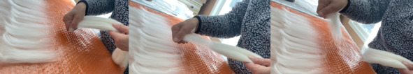 Раскладка шерсти. Шерсть при валянии усаживается по длине волоса. Поэтому, для равномерной усадки мы будем раскладывать шерсть в два слоя крест на крест, по длине и ширине. Нам надо разложить квадрат размером примерно 17х17 inches. В одной руке держите пасму с шерстью, другой, – рабочей рукой, плавно отделяете клок шерсти от пасмы, как показано на фото и видео: https://www.youtube.com/watch?v=zgBJT2T49OU