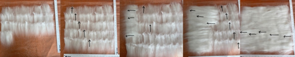 Вначале раскладываем шерсть по вертикале. Затем, чтобы получилось крест-на-крест, по горизонтали.