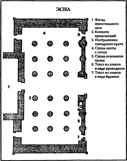 Обратите внимание на изображения в гипостильном зале в Эсне: фигуры на стволах колонн выглядят тяжеловесными и неловкими. Одна из наиболее важных сцен изображает бога Хнума с гончарным кругом (№ 3). Она связана с праздником гончарного круга, который отмечает рождение света и воздуха. Сцены охоты с помощью сети (№ 4) также являются глубоко символичными. Некоторые этапы ритуала основания храма изображены очень подробно (№ 5): забивание колышков после размежевания, засыпка песка в траншеи фундамента, формовка первого кирпича, использование отвеса, передача храма его истинному хозяину – богу. Эти сцены тесно связаны с росписью потолка, где мы видим знаки зодиака, созвездия и путь солнца. Храм словно заключает в себе весь мир, он построен по законам мироздания.