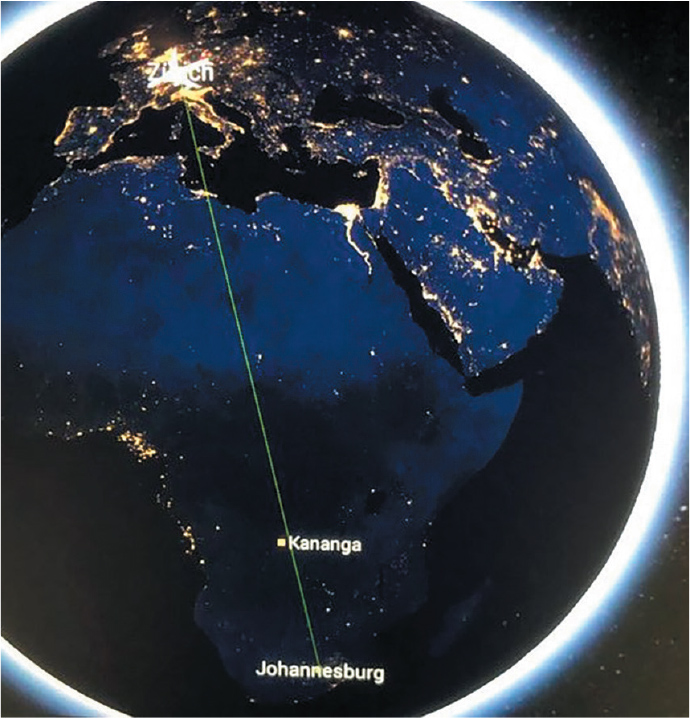 „Pardon?“ Erst als er mit dem Finger über sein Display strich, verstand ich, was er meinte. Ich berührte das Display und nach wenigen Sekunden flackerte das Swiss-Symbol auf. Erleichtert lehnte ich mich nach hinten, um kurz darauf wieder ganz nah mit meiner Nase an den Bildschirm zukommen. Auf dem Display leuchtete jetzt eine große Kugel hell auf. Umrandet von einem weißen Kranz sah ich die Erde und die Flugstrecke, die sich quer vom europäischen Kontinent bis fast zum südlichsten Punkt des afrikanischen Kontinents hinunterzog. Ich staunte. Afrika war im Vergleich zu Europa riesig. Viel größer und gewaltiger, als ich je gedacht hatte. Auf Landkarten sah Europa im Vergleich zu Afrika immer viel größer aus. Nichts da. Der Abstand zwischen Namibia und zu Hause war gewaltig. Auf dem kleinen Bildschirm zwar nur wenige Zentimeter, doch in Wahrheit waren es zehn Flugstunden und Tausende Kilometer.