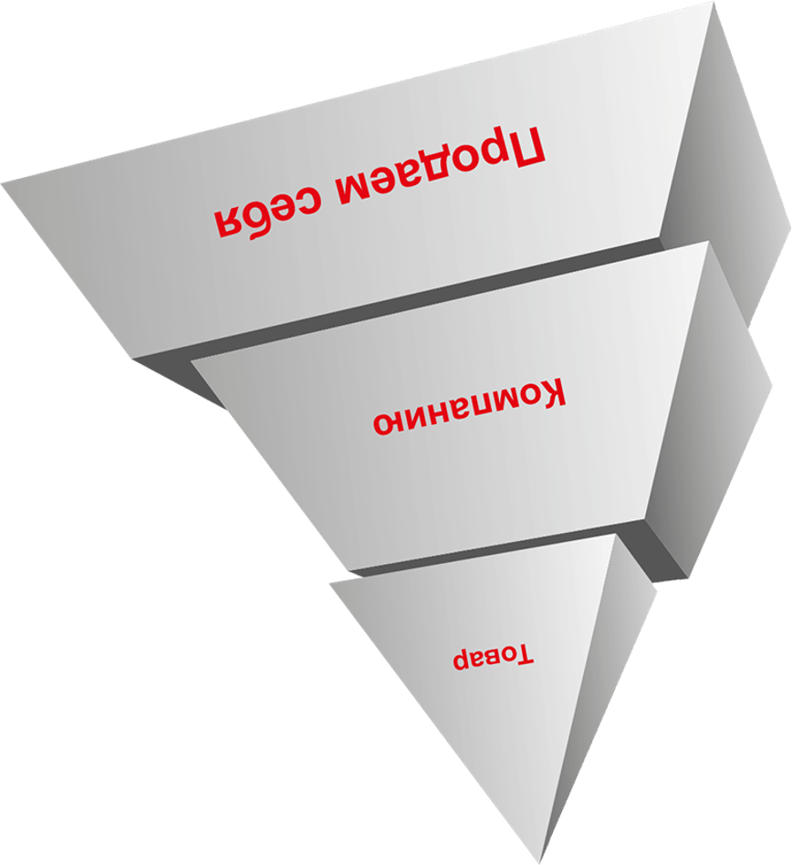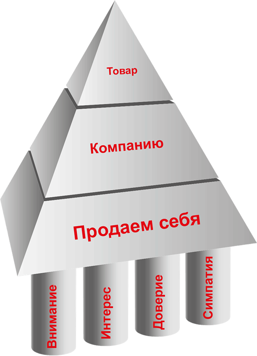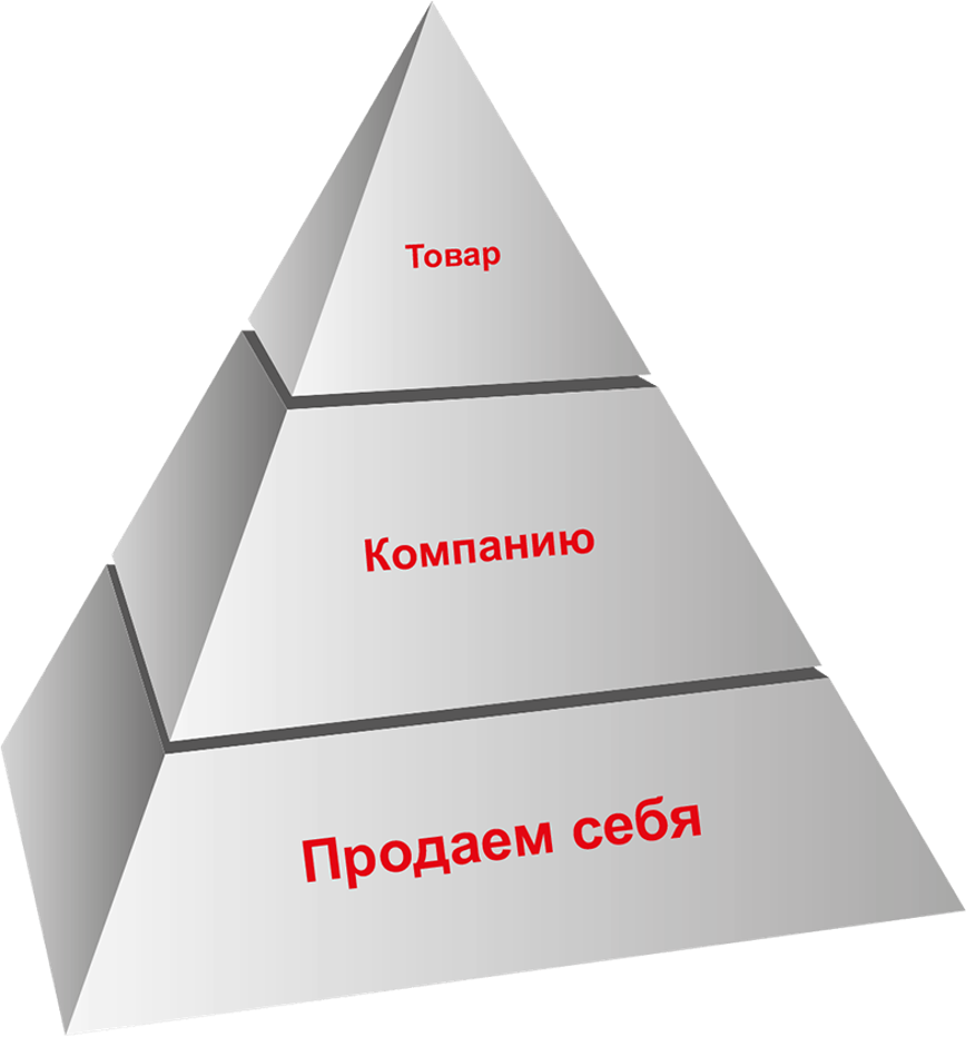 Что бы мы ни продавали, мы вначале продаем себя, потом уже компанию и товар. Если Пирамиду Продаж перевернуть, получается очень неустойчивая, шаткая пирамида. Т. е. если сразу «в лоб» о товаре, о компании, чуть что не так сказано – слышим «спасибо, нам не нужно, не интересно. . .».