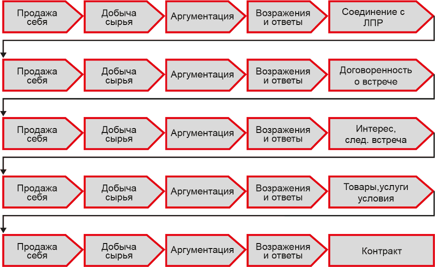 Каждый и любой простой процесс продажи состоит всего лишь из 5 элементов . Даже если мы говорим о повторных продажах или о продаже всего лишь соединения с ЛПР по телефону, все 5 элементов должны присутствовать.