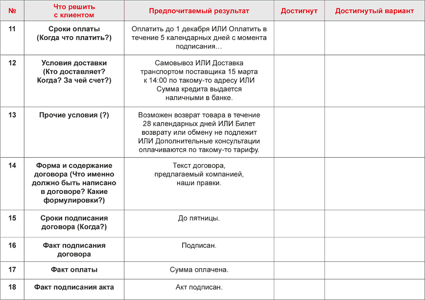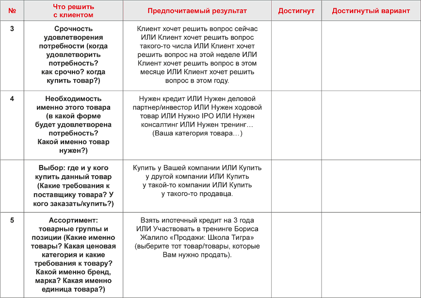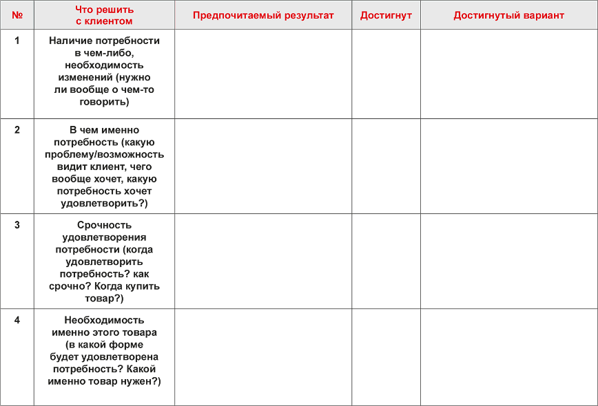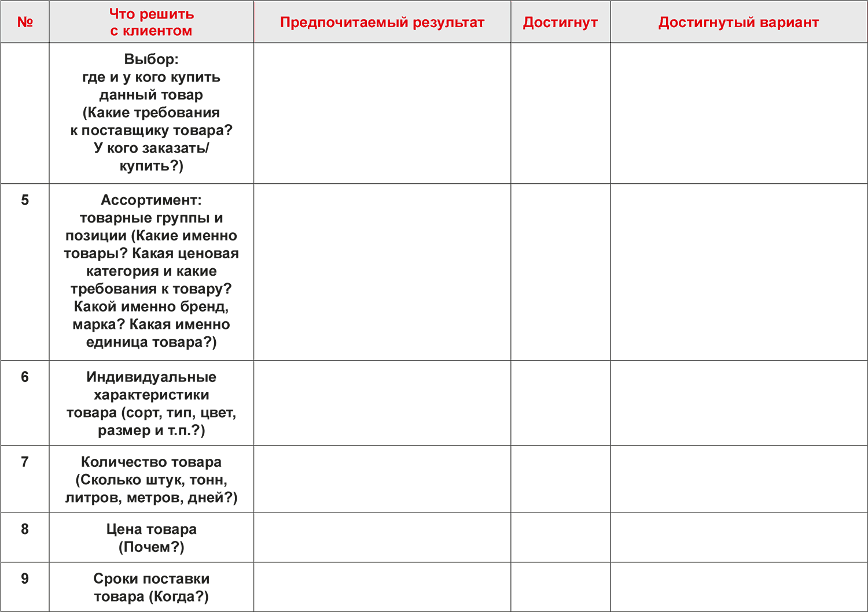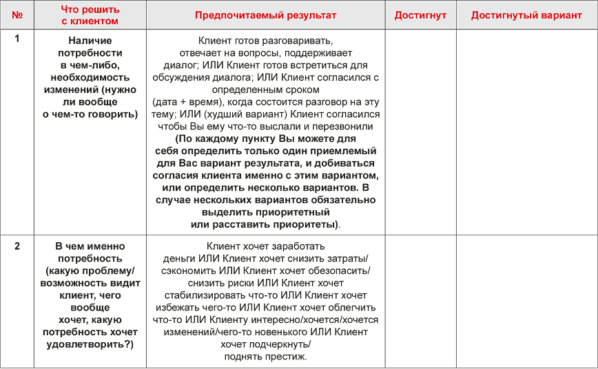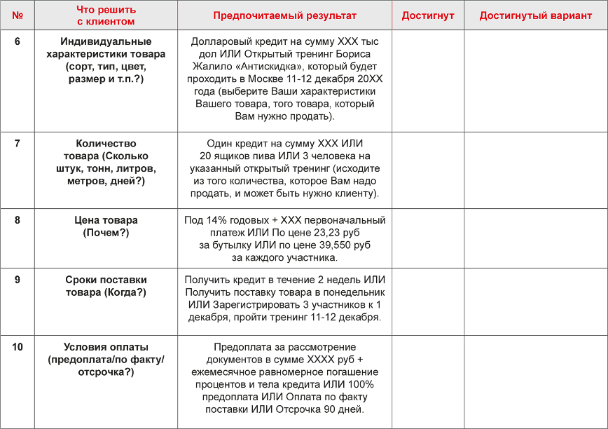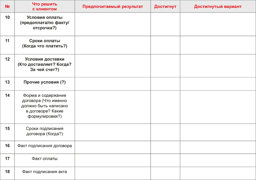 Вырежьте, скопируйте, или распечатайте форму подготовки сделки и «чеклист» (checklist), и заполняйте ее перед/после каждого контакта с клиентом. ДО ТЕХ ПОР? ПОКА Вы не станете это автоматически делать мысленно, четко представляя картинку заполненного листа.