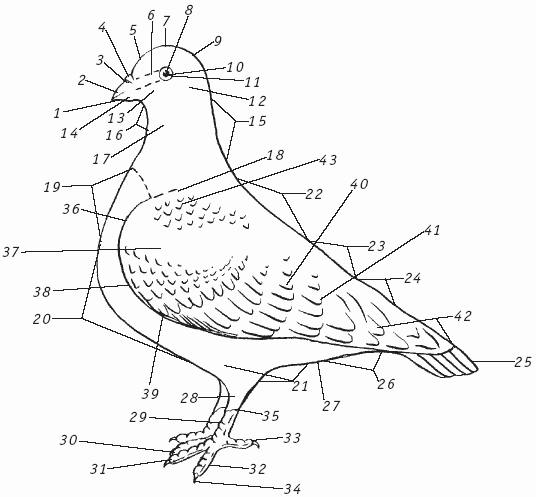 1 – подклювье; 2 – надклювье; 3 – ноздря; 4 – восковица; 5 – лоб; 6 – уздечка; 7 – темя; 8 – веко; 9 – затылок; 10 – радужная оболочка; 11 – зрачок; 12 – оперенное ухо; 13 – щека; 14 – оперенное подклювье; 15 – зашеек; 16 – горло; 17 – шея; 18 – основание шеи; 19 – зоб; 20 – грудь; 21 – брюшко; 22 – спина; 23 – надхвостье (копчик); 24 – верхние кроющие перья хвоста (надхвостье); 25 – рулевые перья; 26 – нижние кроющие перья; 27 – анальное отверстие; 28 – голень; 29 – плюсна; 30 – внутренний палец; 31 – средний палец; 32 – внешний палец; 33 – задний палец; 34 – коготь; 35 – пятка; 36 – передний край крыла (запястный изгиб крыла); 37 – кроющие перья крыла; 38 – палец крыла; 39 – кроющие первостепенных маховых (крылышко); 40 – кроющие второстепенных маховых; 41 – маховые второго порядка (второстепенные); 42 – маховые первого порядка (первостепенные); 43 – плечо