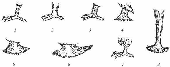 Ноги могут быть длинные, средние и короткие. По оперенности их делят на голоногих, слегка оперенных и космачей (рис. 2). Голоногие голуби совершенно лишены оперения на всей длине плюсны и пальцев (рис. 2, 1). Слегка оперенные имеют плотное короткое оперение различной формы (рис. 2, 2, 3, 4, 5). У космачей ноги оперены обильно и по форме напоминают тарелку (рис. 2, 6, 7, 8).