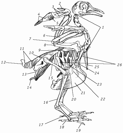 1 – шейные позвонки; 2 – 1-й палец на крыле; 3 – пясть; 4 – 2-й палец; 5 – 3-й палец; 6 – локтевая кость; 7 – лучевая кость; 8 – плечо; 9 – лопатка; 10 – подвздошная кость; 11 – хвостовые позвонки; 12 – копчиковая кость; 13 – седалищная кость; 14 – лонная кость; 15 – бедро; 16 – голень; 17 – цевка (плюсна); 18 – 1-й палец на лапе; 19 – 4-й палец на лапе; 20 – грудина; 21 – киль грудины; 22 – брюшная часть ребра; 23 – спинная часть ребра; 24 – коракоид; 25 – ключица; 26 – грудные позвонки