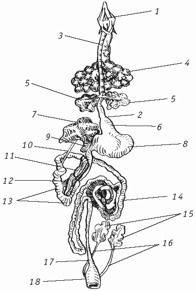 1 – язык; 2 – пищевод; 3 – трахея; 4 – зоб; 5 – легкие; 6 – железистый желудок; 7 – печень; 8 – мускульный желудок; 9 – селезенка; 10 – проток; 11 – поджелудочная железа; 12 – протоки поджелудочной железы; 13 – двенадцатиперстная кишка; 14 – тонкий кишечник; 15 – почки; 16 – мочеточники; 17 – прямая кишка; 18 – клоака