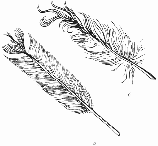 У некоторых пород голубей могут быть фигурные перья в виде кружева или бахромы, когда конец опахала рулевых перьев расщеплен (рис. 5, а), а также с курчавым кончиком опахала, как бы завитым в форме локона (рис. 5, б).