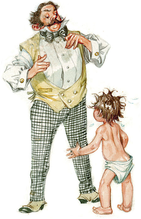 Наверное, найдутся мужчины, которых возмутила бы та лёгкость, с которой женщина справилась с галстуком, однако мистер Дарлинг, человек по натуре добрый, лишь беззаботно поблагодарил жену, через секунду забыв про гнев, а через две уже гарцуя по комнате с Майклом на плечах.